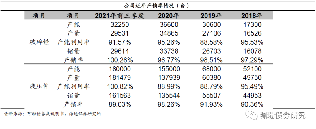 公司产能接近饱和。与我国液压行业市场规模相比,公司产能有较大的发展空间。2018年至2021 年1-9 月,破碎锤产品的产能分别为1.73、3.06、3.66、3.23万台,产能利用率分别为95.53%、 88.58%、95.26%和 91.57%,液压件产品的产能分别为5.21万台、6.8万台、15.5万台、18万台,产能利用率分别为95.49%、88.79%、88.99%和100.82%,各生产线产能已充分释放,处于饱和状态。随着目前我国液压行业国产品牌的市场占有率快速增长,公司各生产线的产能规模有待提升。