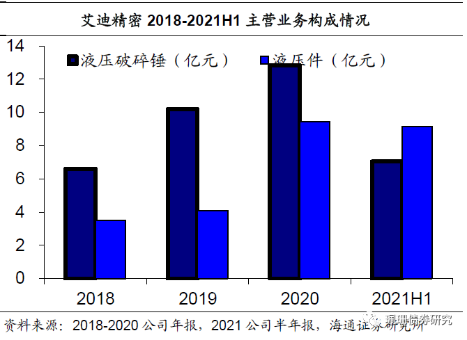 进口替代趋势推动国产液压件发展,公司在液压件方面具备领先优势。全球的高端液压件由博世力士乐、川崎重工等少数外企所垄断,其中博世力士乐、川崎重工占据了相当的国内市场份额,但随着国内液压件工厂的崛起,高端液压件快速实现国产化,国产品牌液压件市场占有率大幅度提升,国产液压件市场份额将会逐年提高。2018-2021H1,液压件占主营业务比重由34.78%提升至56.48%。公司液压件产品主要为液压泵、液压马达和多路控制阀,2018-2020年公司液压主泵和马达产销均增。公司成功研发的液压泵、行走及回转马达、多路控制阀等产品实现了高端液压件的国产化,打破了国外品牌长期垄断的局面,液压件的国产化进程明显加快。