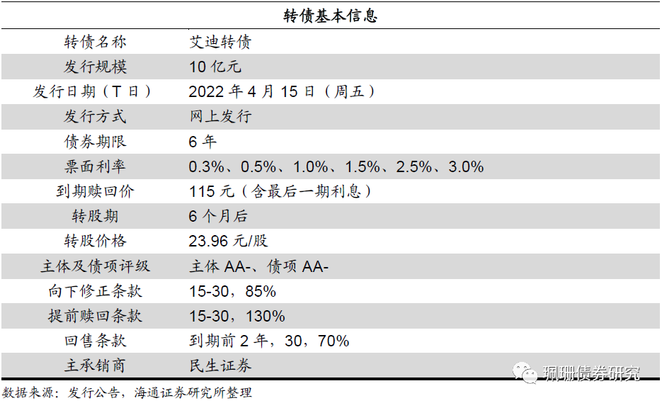 债底保护一般。艾迪转债发行规模10亿元,期限6年,主体信用评级为AA-,债项信用评级为AA-。票面利率:第一年为0.30%、第二年为0.50%、第三年为1.00%、第四年为1.50%、第五年为2.50%,第六年为3.00%,到期赎回价115元。按照4月13日同等级企业债收益率计算,对应债底82.43元,纯债到期收益率为3.182%,债底保护性一般。