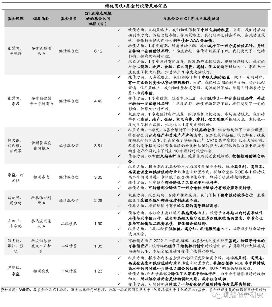 2)绩优固收+基金:债券投资为主,权益保持高ROE水平。Q1绩优固收+基金业绩归因显示:利率债部分降低了久期水平和杠杆率,纯债组合偏防御,以中短久期为主,以及把握信用债调仓机会等。可转债方面减持部分高估值品种,并适当转向偏债性品种,继续持有部分蓝筹类转债等。权益方面,组合整体ROE水平保持较高水平的同时进一步降低组合的估值水平。