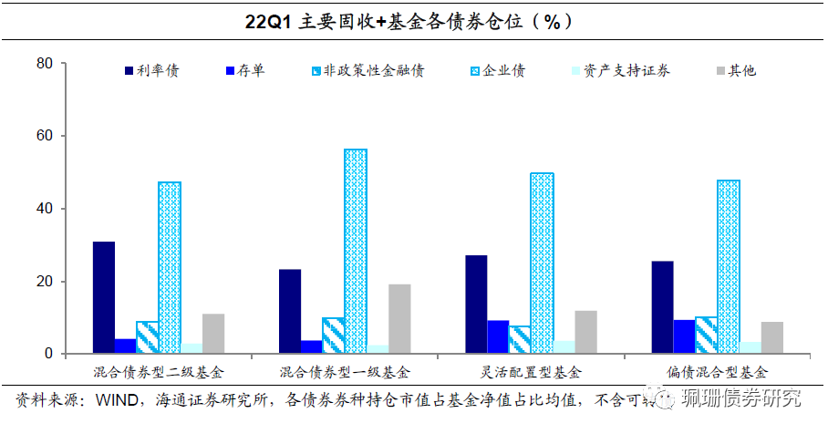 纯债持仓以企业债和利率债为主。22Q1固收+基金持有债券以企业债和利率债为主,二者的债券持仓市值占基金净值比重的平均水平约为73%~80%。相比于21Q4,存单和资产支持的仓位下降,除混合债券型一级基金下调利率债仓位之外,其余固收+基金对利率债、非政策金融债、企业债等仓位均提升。
