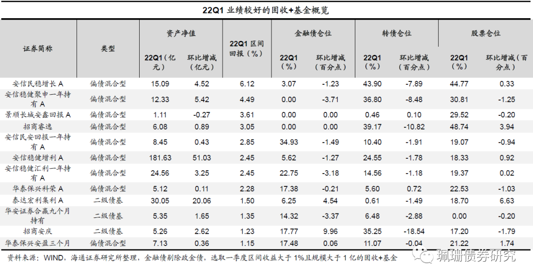 债券重仓券以利率债为主。22Q1固收+基金前五重仓券以利率为主,其持仓市值占前五重仓券总持仓市值占比高达38%,其次是非政策金融债、占比为23%,再者是信用债和可交可转债,占比分别为20%、13%,存单重仓占比较低、仅4%。