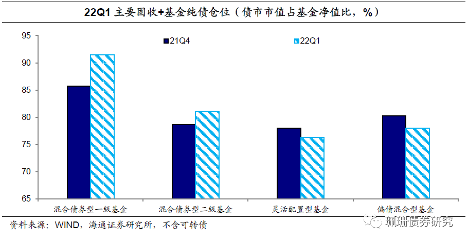 纯债券仓位小幅提升。相比于21Q4,22Q1固收+基金的债券仓位提升0.65个百分点,其中混合债券型一级基金和混合债券型二级基金债券仓位明显提升,而灵活配置型基金、偏债混合型基金的债券仓位均下降。