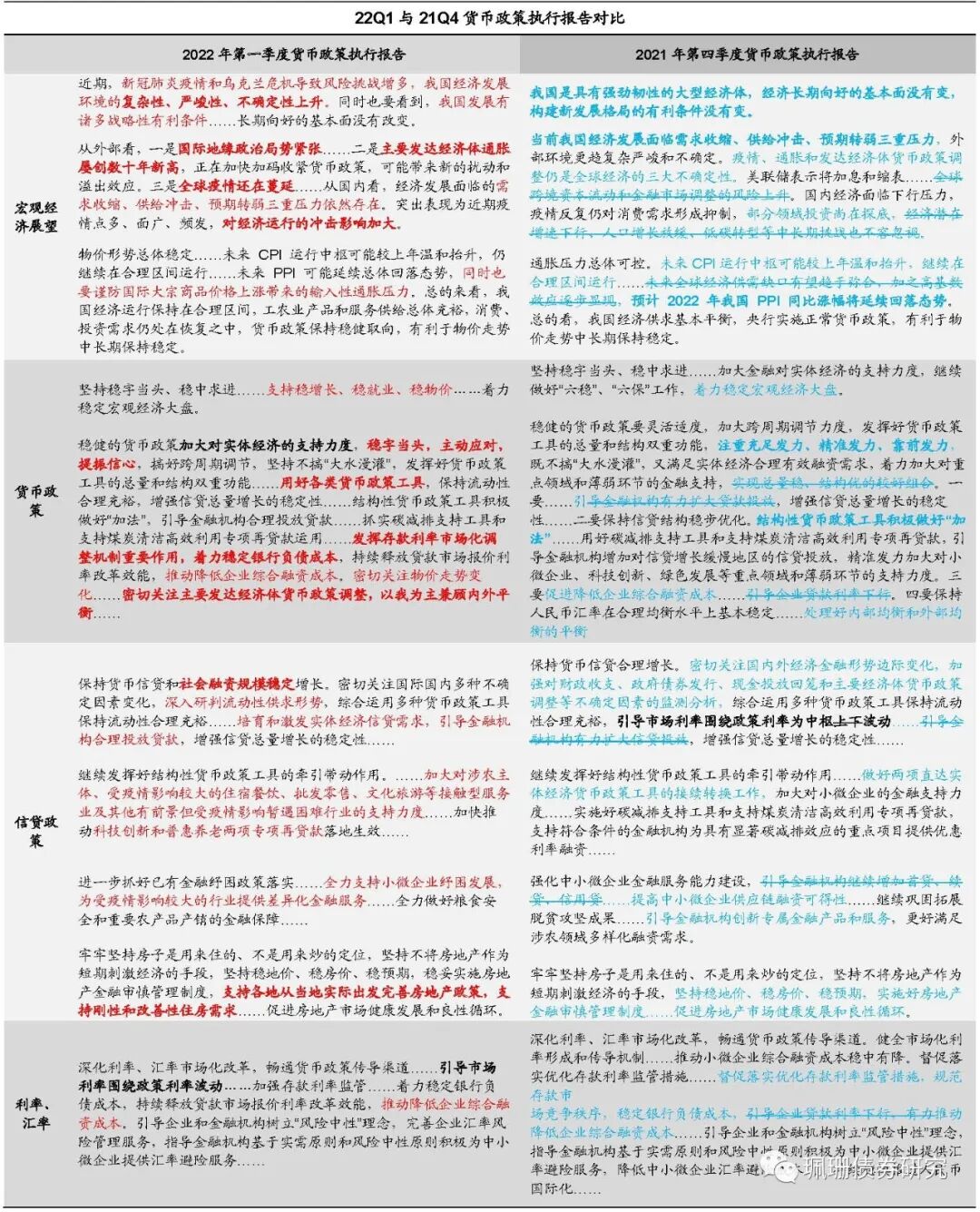 内外基本面压力加大,物价稳定谨防输入性通胀。21Q4货币政策执行报告基本延续4月底政治局会议基调,相较于21Q4的货政报告,基本面方面强调内外部压力。外部来看,国际地缘政治局势紧张,主要发达经济体加快加码收紧货币政策,全球疫情蔓延。从国内看,经济发展环境的复杂性、严峻性、不确定性上升,三重压力依然存在,近期疫情点多、面广、频发,对经济运行的冲击影响加大。通胀方面,央行依然认为未来CPI中枢温和抬升,PPI延续回落态势,但同时也要谨防国际大宗商品价格上涨带来的输入性通胀压力。