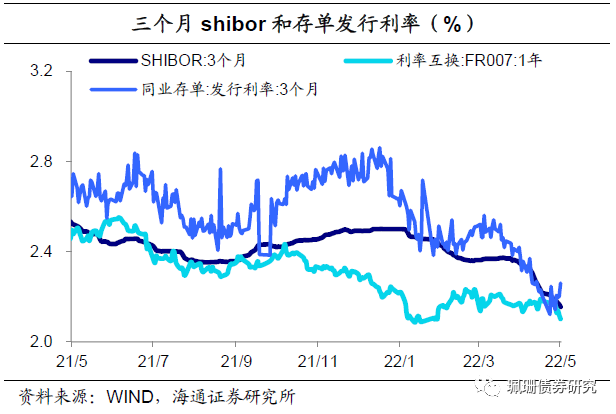 新增存款利率下降,但存量降幅还不明显。央行强调发挥存款利率市场化调整机制重要作用,着力稳定银行负债成本。专栏三《建立存款利率市场化调整机制》提到,2021年6月存款利率自律上限优化后,新发生定期存款加权平均利率为2.37%(22年3月水平),同比下降8BP,较优化前的2021年5月下降12BP。但2021年上市银行年报显示,计息负债中存款成本率普遍抬升、其中农商行存款成本率环比上升6BP,或与期限结构调整有关。即虽然1Y以上利率上限下调,但银行如果增加了中长期存款占比、降低活期占比综合成本依然偏高。2022年4月人民银行指导利率自律机制建立了存款利率市场化调整机制,参考十年国债利率与1YLPR调整存款利率,国有大行、部分股份行和地方行均下调1年以上期限定期存款和大额存单利率,4月最后一周新发生存款利率环比下降10BP。