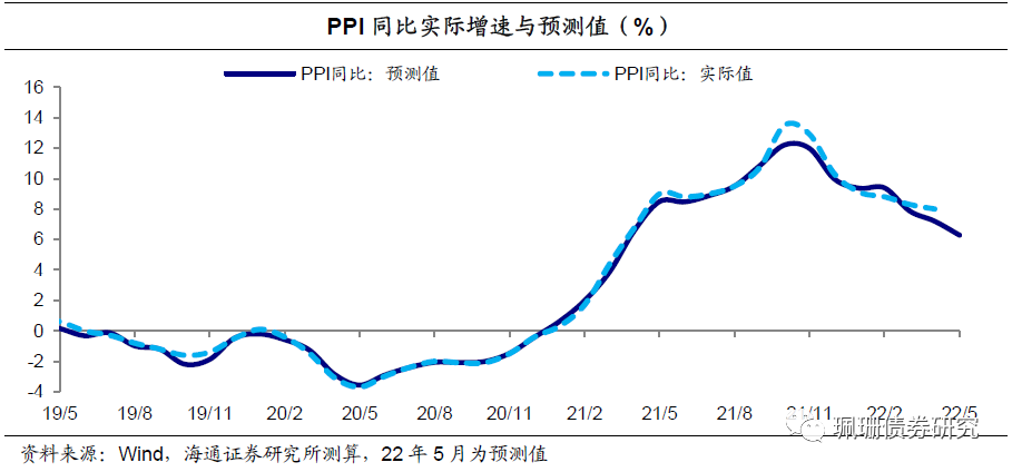 预计5月延续CPI回升、PPI回落趋势。5月以来猪价同比降幅大幅收窄,鲜菜和水果价格同比增速也放缓,国内疫情对消费的影响仍偏强,预计5月CPI同比增速或继续抬升;PPI方面,5月以来国际原油价格同比增速震荡回落,国内油价回落、钢价同比增速转负、煤价同比涨势放缓,预计5月PPI或继续回落。