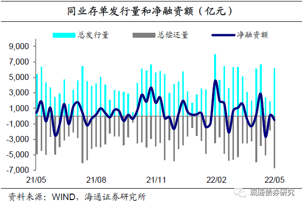 同业存单量价齐跌。上周,同业存单发行6176亿元,环比增加4315亿元,到期6688亿元,净融资额-511亿元、环比减少601亿元;股份制银行1年同业存单发行利率较5月7日环比下行7BP至2.34%。