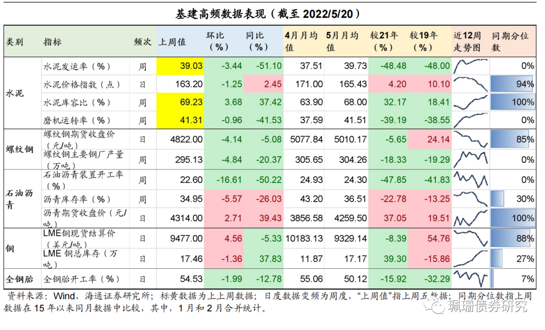 基建生产类指标环比走弱。截至5月20日,最新的基建高频数据显示,上周生产类指标走弱,螺纹钢产量、石油沥青装置开工率、全钢胎开工率环比同比均下降。库存类指标方面,沥青库存率环比同比均降,LME铜库存环比降同比升。价格类指标表现分化,螺纹钢期货收盘价同比环比下降,沥青期货收盘价、LME铜现货结算价环比上升。![]()