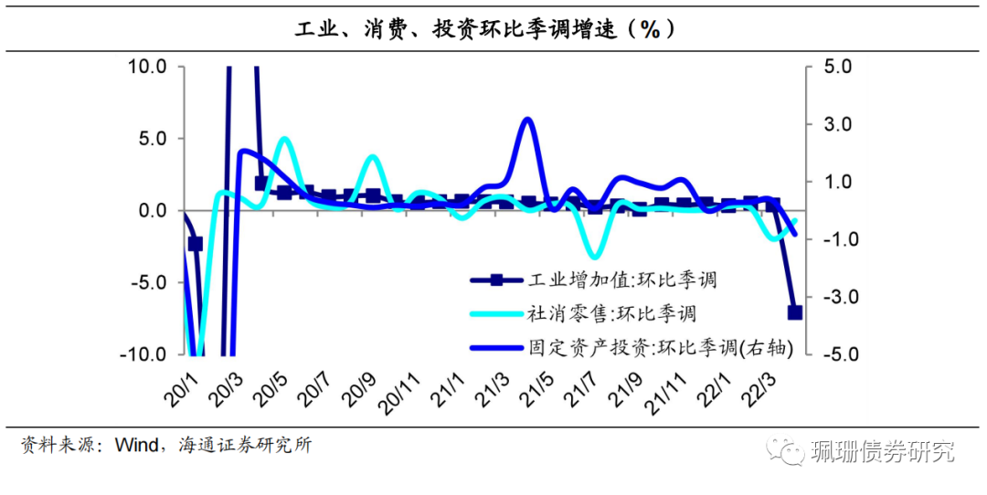 4月经济快速下行,环比低点或已显现。从生产法来看,呈现工业和服务业双弱的局面;从三驾马车看,出口继续明显回落、投资大幅转弱、消费恶化加剧(失业率大幅回升至6.1%);从季调环比来看,工业、投资均为20年3月以来首次负增长,消费降幅收窄。展望后续,预计消费二季度压力仍大,制造业投资压力增大,地产投资或继续承压,基建投资后续或依然托底经济。