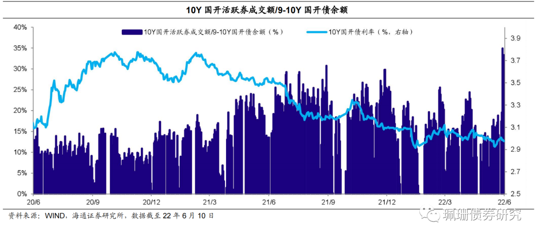(3)从10Y国开活跃券成交额/9-10Y国开债余额来看,债市情绪明显改善。至6月10日10Y国开活跃券成交额/9-10Y国开债余额处于近三年以来的100%分位数,周均值环比大幅提升,显示10Y国开活跃券交易情绪改善。