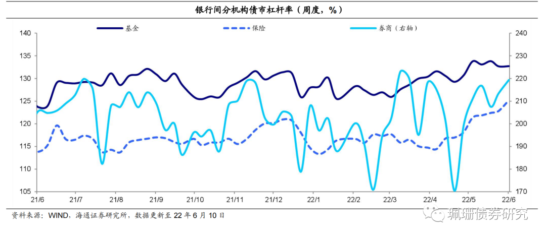 (6)上周,银行间杠杆率回落。至6月10日当周银行间债市杠杆率为108.9%,环比下降0.25个百分点、同比上行1.4个百分点。