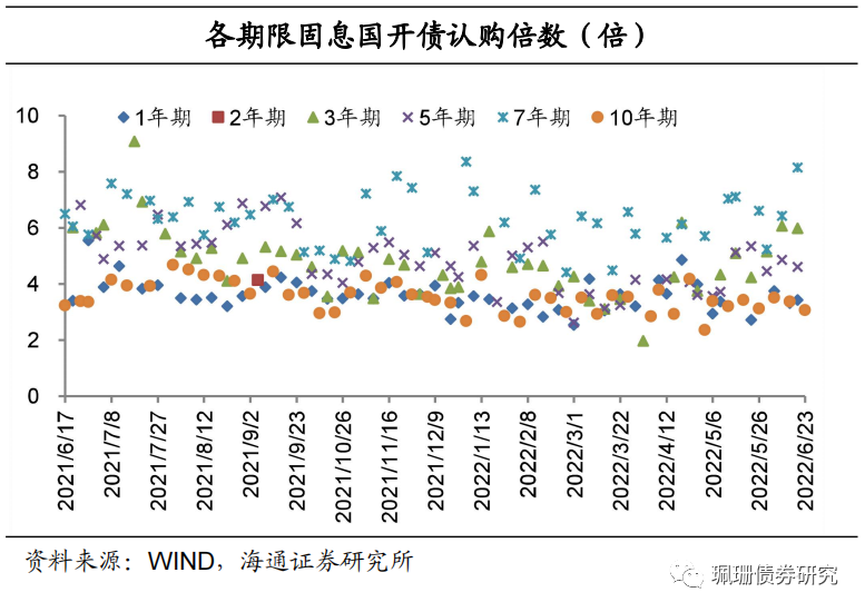 进出口行债需求分化,21进出08(增8) 的认购倍数分别为7.48倍,需求较好;22进出03(增2) 、22进出15(增发)、22进出680、22进出12(增6)、22进出04(增7)、22进出10(增15)的认购倍数分别为4.78 倍、3.84 倍、3.64 倍、3.49 倍、2.92 倍、2.60倍,需求一般。国债需求尚可,22附息国债10(续发)、22附息国债11(续发)的认购倍数分别为4.63倍、3.82倍,需求尚可;22附息国债13、22贴现国债29的认购倍数为3.61倍、3.13倍,需求一般。农发债需求一般,22农发03(增8)、22农发04(增3)、22农发05(增3)、22农发02(增14)的认购倍数分别为4.41倍、3.75 倍、3.66倍、3.58倍,需求一般;22农发清发03的认购倍数为5.61倍,需求尚可;22农发清发02(增发16)的认购倍数为4.43倍,需求一般。![]()