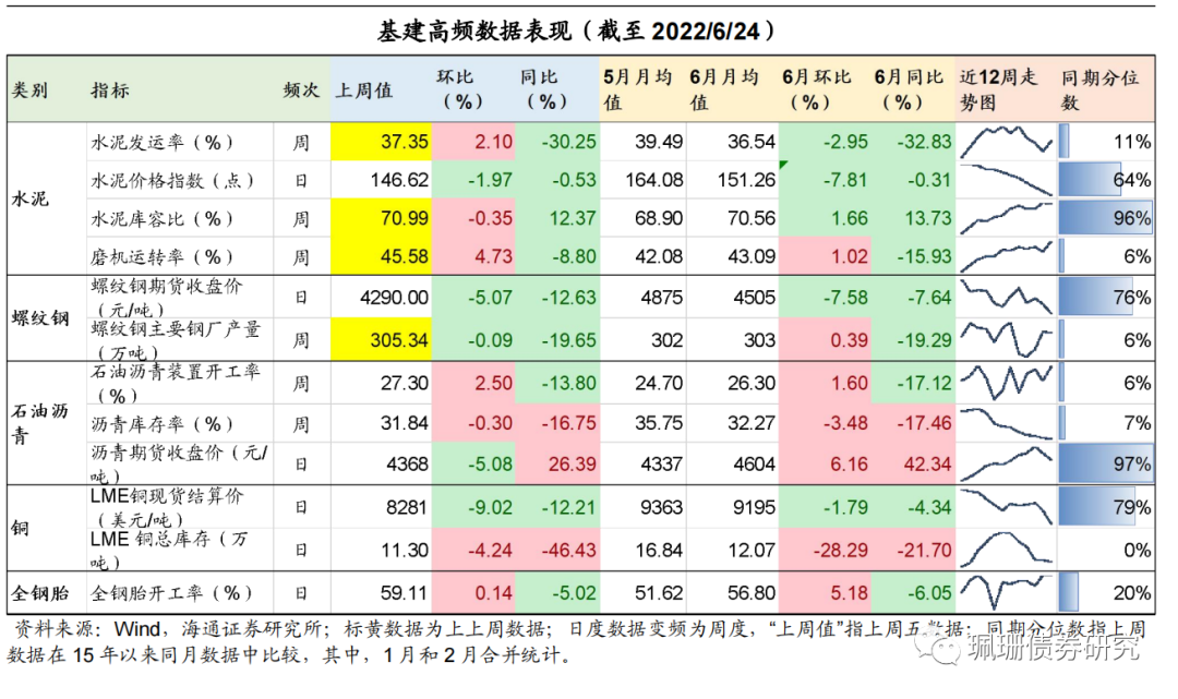 基建生产类指标环比改善,库存下降,价格下降。截至6月24日,最新的基建高频数据显示,上周生产类指标整体环比改善,石油沥青装置开工率、全钢胎开工率均继续环比上升,但仍处于历史同期最低位(与15年以来同月数据比较)。库存类指标方面,沥青库存率、LME铜库存环比同比均降。价格类指标中,水泥价格指数、螺纹钢期货价、沥青期货价和LME铜价均环比下降。![]()