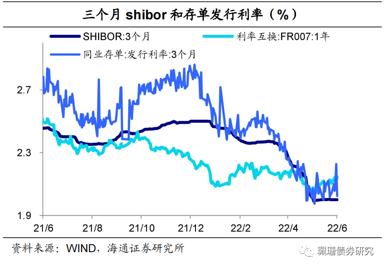同业存单量价齐跌。上周,同业存单发行4166亿元,环比减少3319亿元,到期5367亿元,净融资额-1202亿元,环比减少4940亿元;股份制银行1年同业存单发行利率较6月17日环比下行8.4BP至2.30%。![]()
