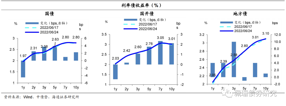 上周债市窄幅震荡,短债收涨,长债收跌,曲线走陡。上周地方债持续放量,周度利率债发行规模为年内次高;缴税走款对资金面形成扰动,资金利率有所回升,短债收益率周二至周四持续下行,周五小幅回升1bp;长债收益率小幅震荡,周五上升2bp。具体来看,与6月17日相比, 6月24日1年期国债收益率下行4BP至1.97%,10年期国债收益率上升2BP至2.80%;1年期国开债收益率小幅下行1BP至2.03%,10年期国开债收益率上行2BP至3.01%。![]()