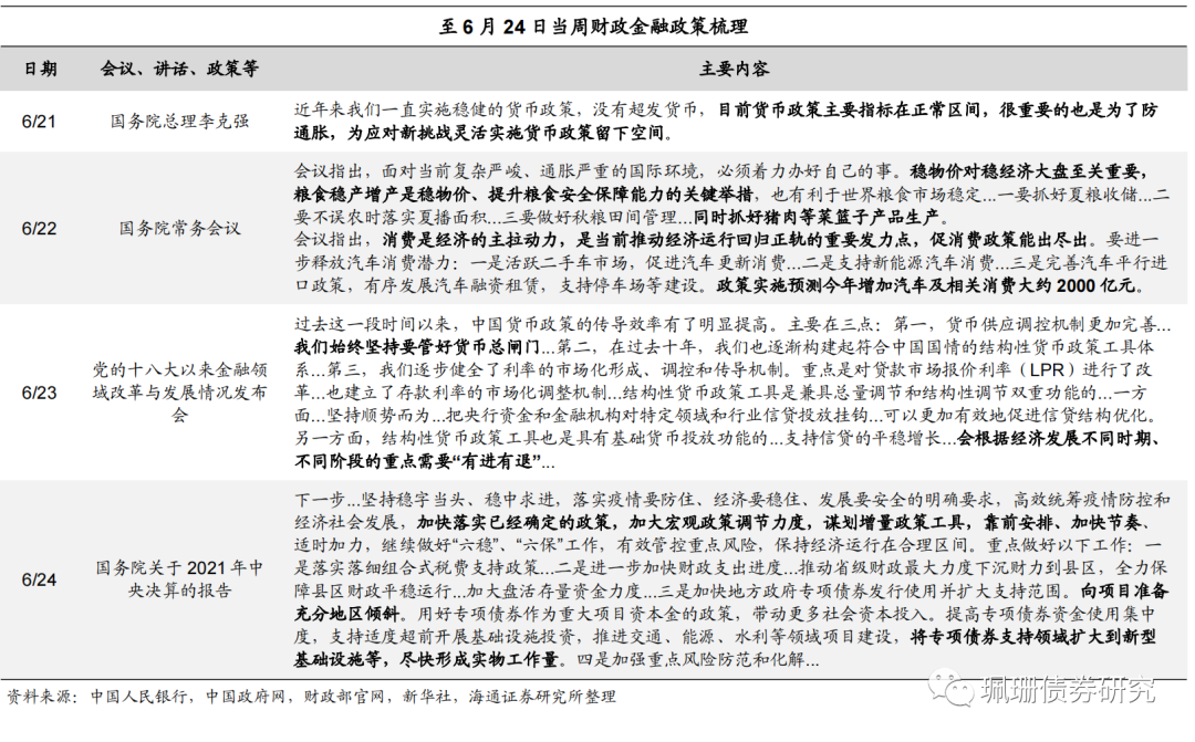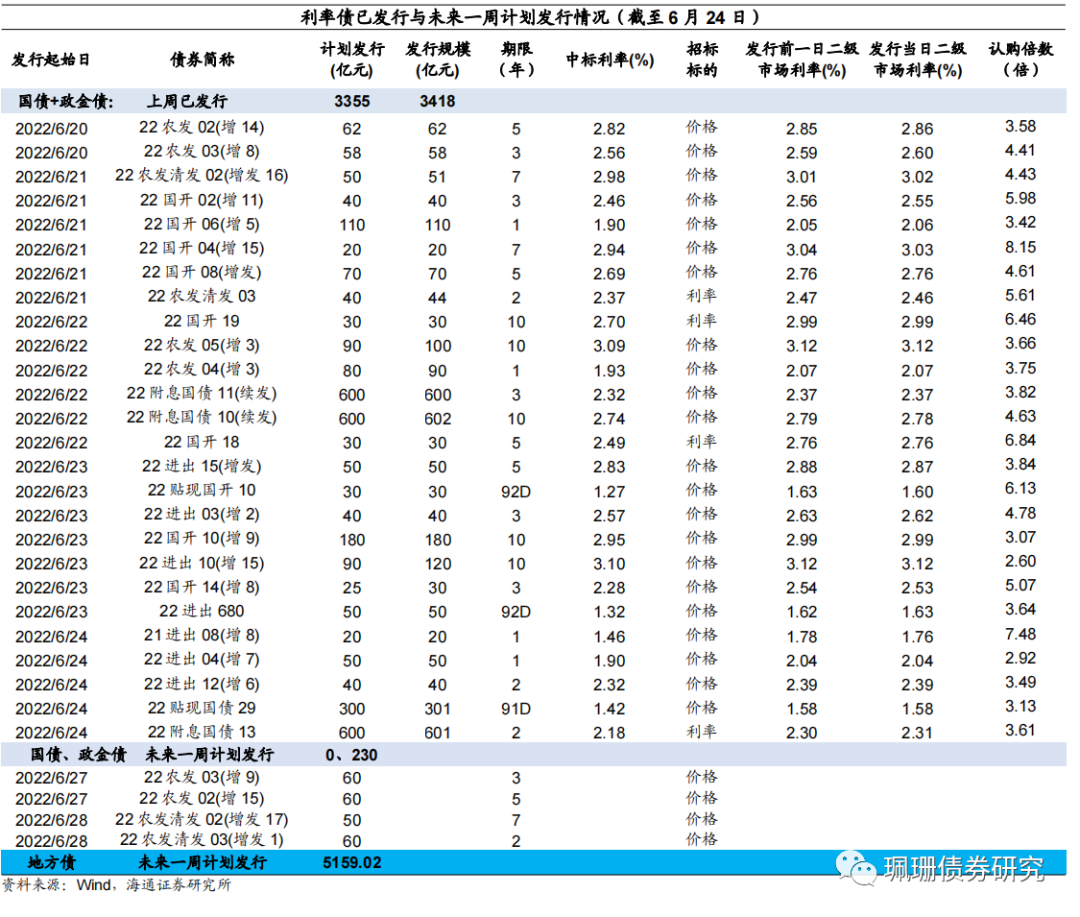周度净融资规模再创年内新高,一级市场招投标整体需求分化,同业存单量价齐跌。上周,利率债净融资额7031亿元,环比增加209亿元,净融资额再创年内新高;国开债、进出口行债需求分化、国债需求尚可、农发债需求一般;截至6月24日,未来一周国债计划发行0亿元;地方政府债计划发行5159.02亿元,环比下降。