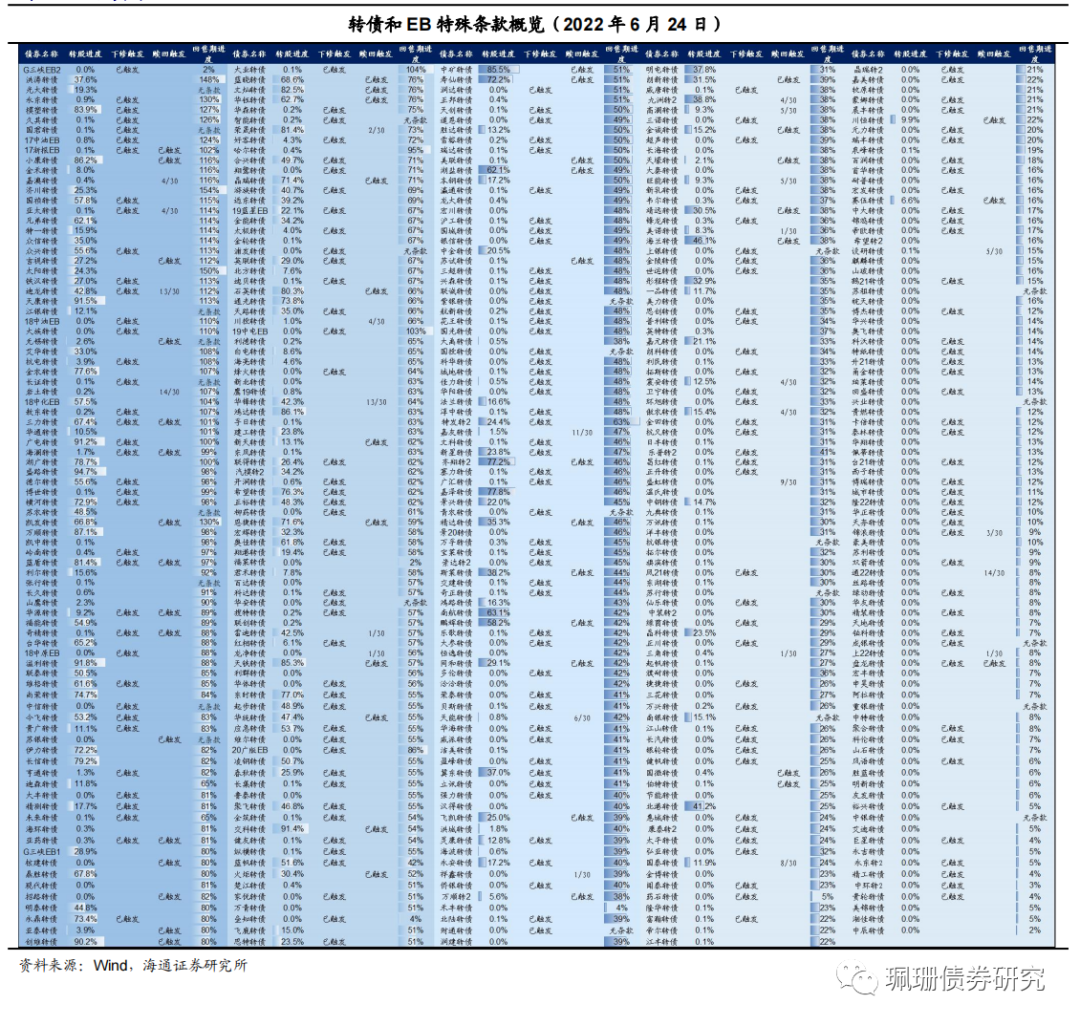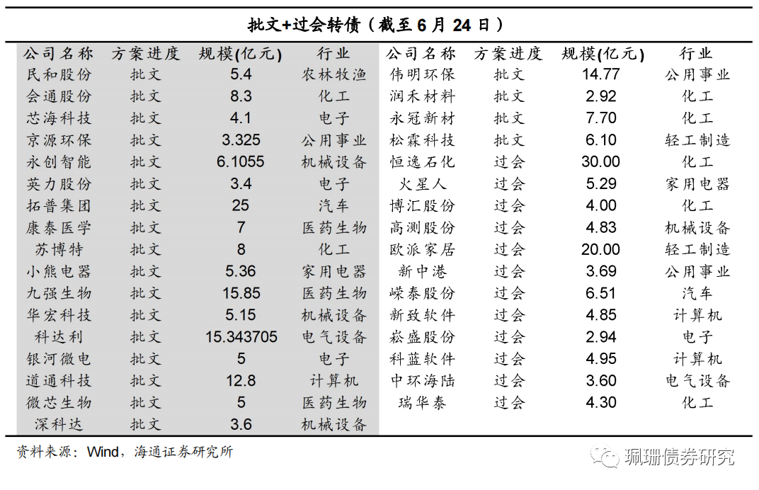 上周无公司发布转债上市公告。上周新疆天业(30.00亿)、富春染织(5.70亿)、华锐精密(4.00亿)、丰山集团(5.00亿)、洁特生物(4.40亿)等发布转债及可交债发行公告。审批方面,上周松霖科技(6.10亿)、微芯生物(5.00亿)、深科达(3.60亿)、伟明环保(14.77亿)、润禾材料(2.92亿)、永冠新材(7.70亿)转债获批文。新致软件(4.85亿)、瑞华泰(4.30亿)、中环海陆(3.60亿)转债过会。上周春秋电子(5.70亿)、莱克电气(12.00亿)、航天宏图(10.60亿)转债获受理。天合光能(88.90亿)、南玻A(28.00亿)、宇瞳光学(8.00亿)等公布转债预案。无转债预案修订。无终止转债发行。截至2022年6月24日,待发新券共3426.88亿元,共207只(待发转债详见附表2)。其中批文+过会的转债265.18亿元,共33只。![]()