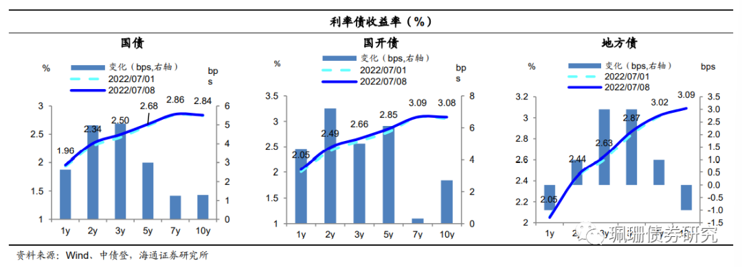 上周债市先跌后稳,曲线走平。上周,央行连续5日逆回购缩量投放30亿元,1Y国债利率在上周一至周二累计上行8bp,随着情绪利空消化后利率转为下行。整体来看,上周央行逆回购缩量操作利空较快Price in,地方债供给缩量,利率债净供给压力大幅减小,资金利率环比大幅下行、资金面宽松延续,部分地区疫情发酵,中高频数据显示经济修复力度偏弱,市场交易信贷和社融的良好预期,日本前首相安倍晋三遭枪击事件使得市场避险情绪升温,最终10Y国债利率在上周一上行2BP、而上周二至周五大体企稳。