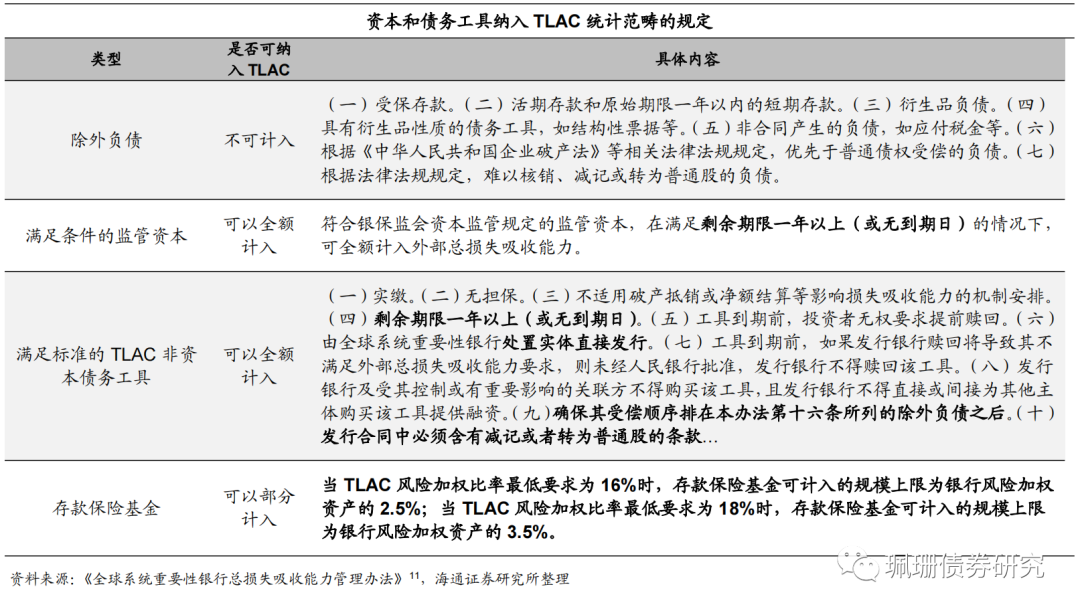如上文所述定义,TLAC由资本和债务工具构成。《办法》对于可纳入TLAC统计范畴的资本和债务工具条件进行了规范:
