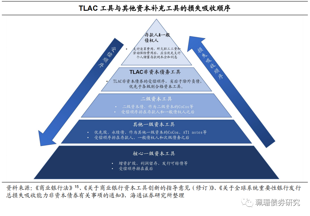 TLAC统计范畴与TLAC非资本债务工具。1)TLAC由资本和债务工具构成,其本质目的在于提高银行进入处置阶段时的损失吸收能力。除普通股、优先股、永续债、二级资本债等资本补充工具外,能够吸收损失的债务工具和存款保险基金也应当计入TLAC,其中最为典型的是TLAC非资本债务工具。2)合格TLAC非资本债务工具要求发行合同中必须含有减记或者转为普通股的条款,当二级资本工具全部减记或者转为普通股后,再启动对外部总损失吸收能力非资本债务工具的减记或者转为普通股。