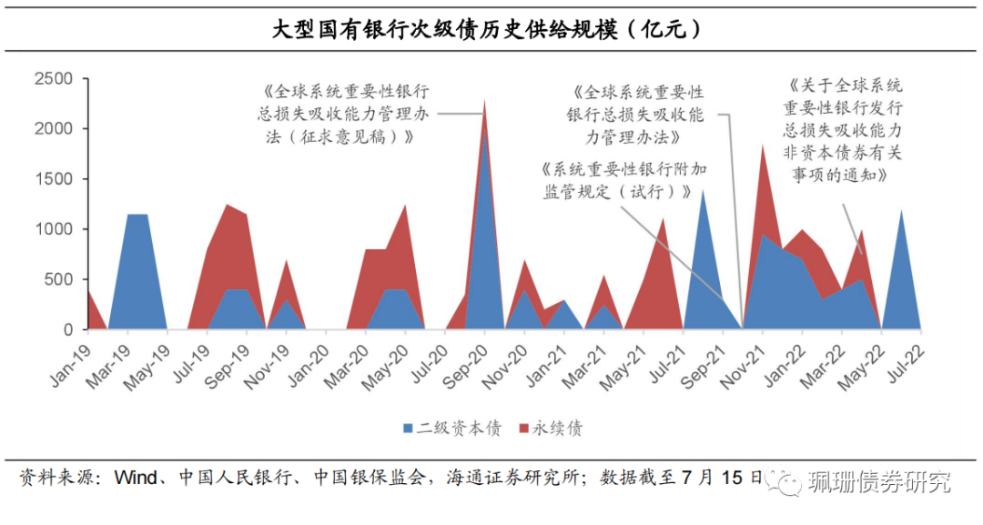 从次级债历史供给来看,监管要求会催生银行发行次级债需求。20年《全球系统重要性银行总损失吸收能力管理办法(征求意见稿)》等几次银行监管文件对系统重要性银行的资本提出了更高的要求。在监管文件出台后,国有商业银行的次级债往往会迎来发行高峰。