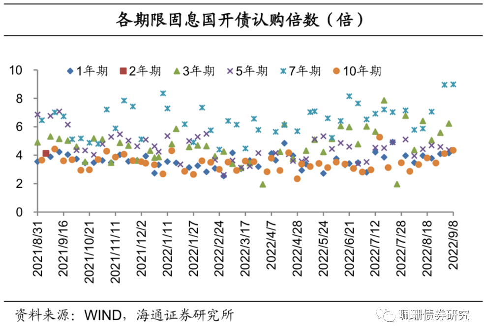 国开债需求分化,22国开09、22国开17(增8)的认购倍数分别为8.99倍、7.47倍,需求较好;22国开07(增2)、22国开15(增8) 的认购倍数分别为6.23倍、4.34倍,需求尚可;22国开08(增12)、22国开11(增6)的认购倍数分别为4.37倍、4.16倍,需求一般。