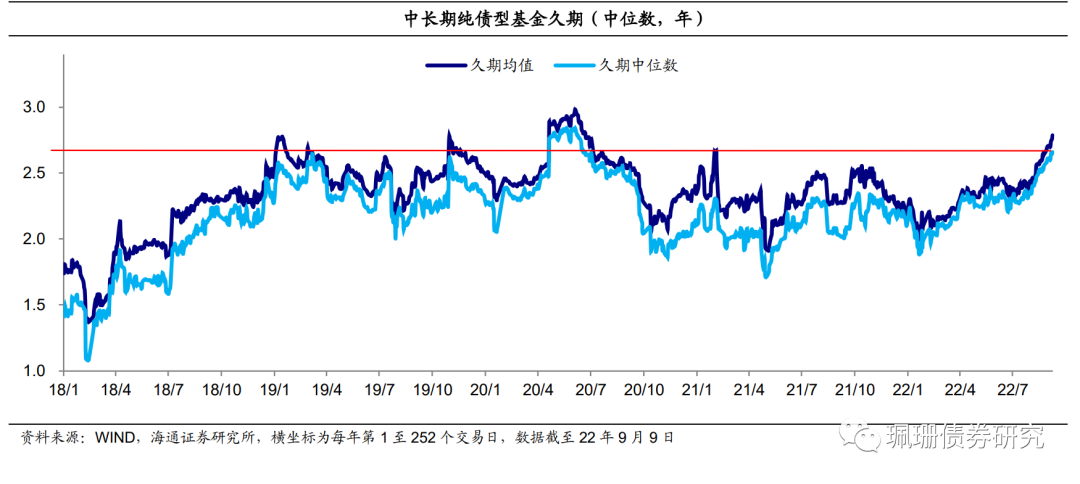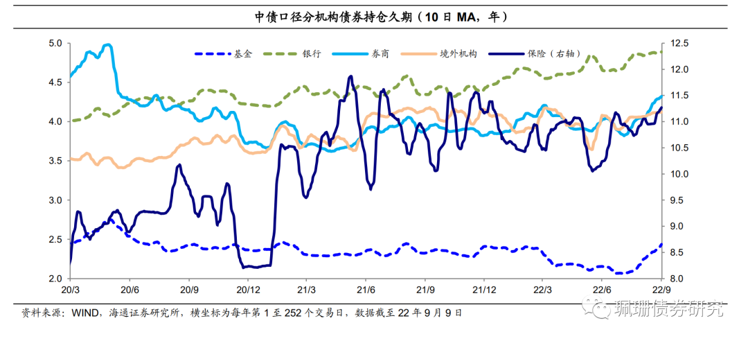 中长期纯债型基金久期(再创年内新高、回到2020年6月末的水平)/中债口径基金、银行和境外机构的债券持仓久期。