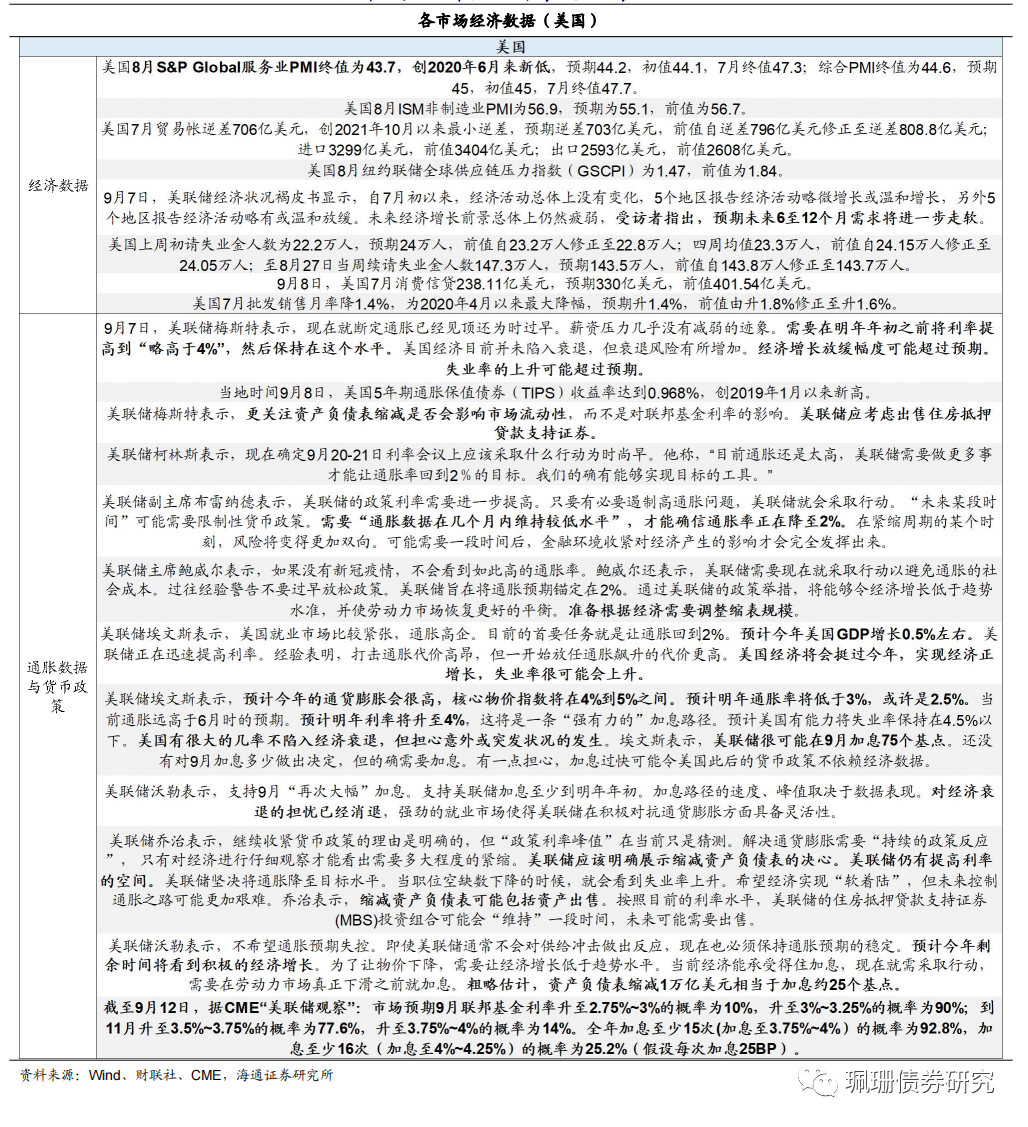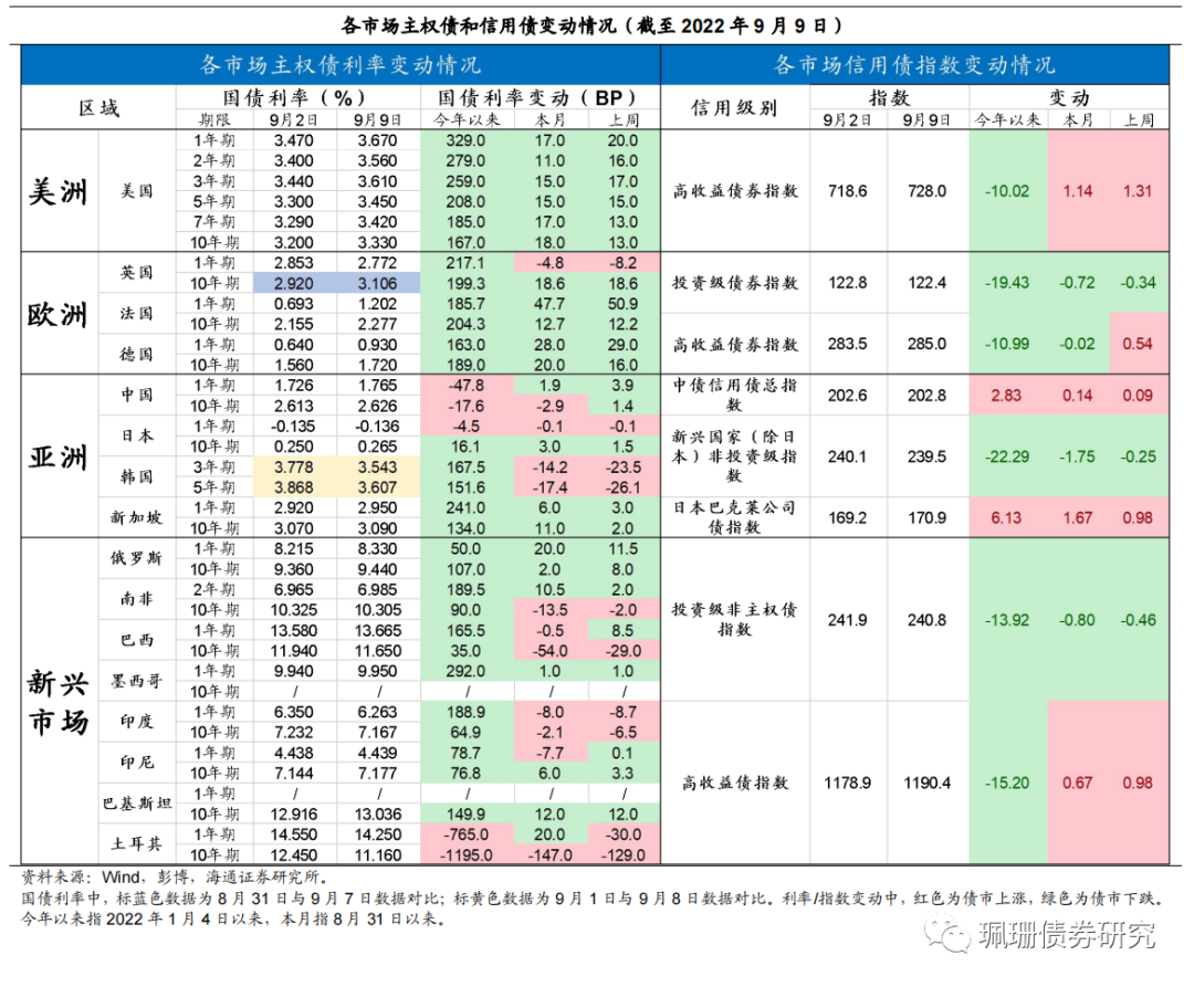 Global服务业PMI终值为43.7,创2020年6月来新低;美国8月ISM非制造业PMI为56.9,高于前值和预期;美国8月纽约联储全球供应链压力指数(GSCPI)为1.47,前值为1.84;美联储经济状况褐皮书显示,未来经济增长前景总体上仍然疲弱,受访者指出,预期未来6至12个月需求将进一步走软。美联储官员密集鹰派表态,市场加息预期升温。美联储梅斯特表示,需要在明年年初之前将利率提高到“略高于4%”,然后保持在这个水平;美联储副主席布雷纳德表示,需要“通胀数据在几个月内维持较低水平”,才能确信通胀率正在降至2%;美联储主席鲍威尔表示,准备根据经济需要调整缩表规模;美联储沃勒表示,支持9月“再次大幅”加息。支持美联储加息至少到明年年初;截至9月12日,据CME“美联储观察”:市场预期9月联邦基金利率升至2.75%~3%的概率为10%,升至3%~3.25%的概率为90%;到11月升至3.5%~3.75%的概率为77.6%,升至3.75%~4%的概率为14%。全年加息至少15次(加息至3.75%~4%)的概率为92.8%,加息至少16次(加息至4%~4.25%)的概率为25.2%(假设每次加息25BP)。美国。主权债:美债下跌。22/9/2-22/9/9,2Y美债利率上行16bp至3.56%,10Y美债利率上行13bp至3.33%;10Y-2Y美债利差倒挂幅度由9月2日的20bp走阔至23bp。信用债:高收益债指数上涨。欧洲。主权债:法国、德国债市下跌,长短端利率均上行;英国债市分化,短端利率下行,长端利率上行。信用债:投资级债券指数下跌,高收益债指数上涨。亚洲。主权债:韩国债市上涨,长短端利率均下行;日本债市分化,短端利率下行,长端利率上行;中国、新加坡债市下跌,长短端利率均上行。信用债:中债信用债总指数、日本公司债指数均上涨,新兴国家(除日本)非投资级指数下跌。新兴市场。主权债:俄罗斯、印尼债市下跌,长短端利率均上行;土耳其、印度债市上涨,长短端利率均下行;墨西哥短端利率上行;巴基斯坦长端利率上行;南非、巴西债市分化,短端利率上行,长端利率下行。信用债:投资级非主权债指数下跌,高收益债指数上涨。中资美元债:投资级收益率平均上行,投机级价格平均下跌。投资级中资美元债收益率平均上行7.9BP,投机级中资美元债价格平均下跌0.06%。--------------------