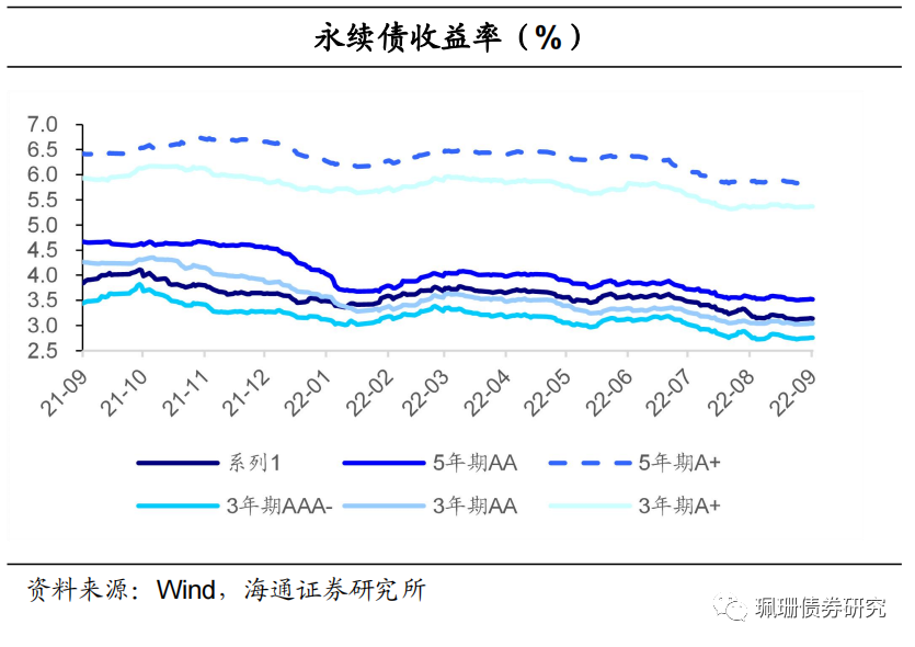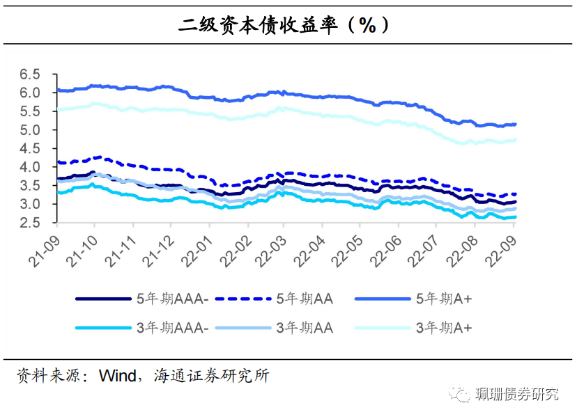 永续债和二级资本债收益率小幅波动。9月前半月,二级资本债和永续债收益率窄幅波动(相较于8月31日),二级资本债方面,5年期各等级收益率变动幅度在-3BP~1BP之间,3年期AAA-收益率下行6BP,其余等级变动幅度在-4BP~3BP之间。永续债方面,5年期和3年期各等级收益率变动幅度在-5BP~0BP之间。