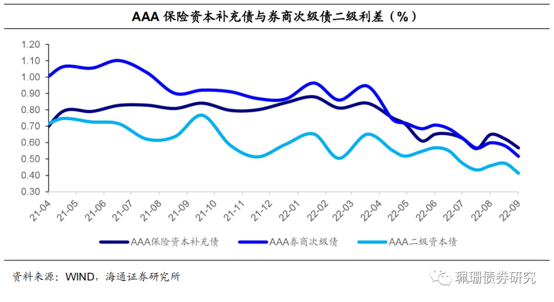二级利差继续下降。我们用存量AAA债券的估值收益率减去当天相同剩余期限国开债收益率作为个券利差,以个券余额占存量AAA债券总余额的比重作为权重,计算AAA保险资本补充债、券商次级债和二级资本债的二级利差。截至9月15日,保险资本补充债、券商次级债的二级利差分别为0.57%、0.52%,较8月31日分别下行5.5BP、6.4BP。对比来看,截至9月15日,AAA券商次级债、保险资本补充债平均利差分别高于二级资本债15BP、10BP。