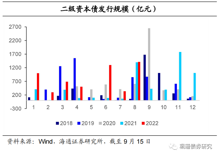 9月前半月(9/1-9/15,下同),共有2只商业银行永续债发行,分别为300亿元的国有大行永续债和8亿元的外资银行永续债,无新发二级资本债;商业银行次级债发行规模较前一统计周期(8/16-8/31,下同)环比下降1310亿元。截至9月15日,今年共发行商业银行次级债券7950亿元。