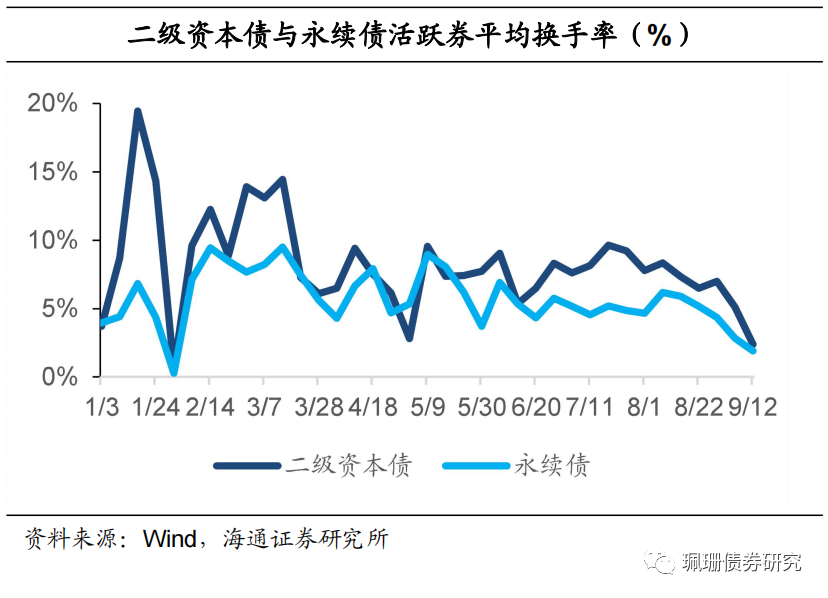 二级成交:二级资本债成交回落、收益率窄幅震荡。9月前半月,商业银行次级债券成交额合计4118亿元。其中,二级资本债成交额为2338亿元,较前一统计周期环比减少1000亿元;永续债成交额为1780亿元,较前一统计周期环比增加168亿元。永续债和二级资本债收益率小幅波动。二级资本债和永续债活跃券成交额与换手率双双下降。