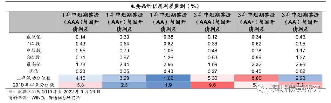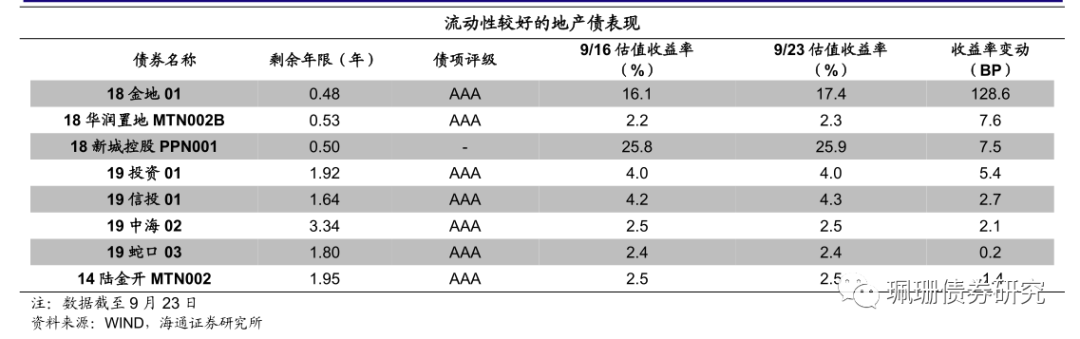 地产行业超额利差持平。具体来看,截至9月23日,AAA级地产行业超额信用利差为52BP,与前一交易周末持平。AA级地产行业超额信用利差为31BP,与前一交易周末持平。