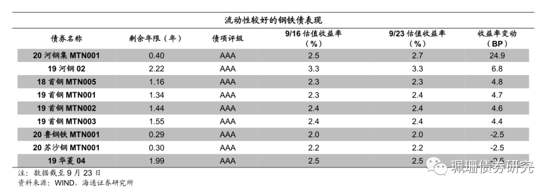 本周我们观测的钢铁债样本中,代表性债券的收益率上行为主。具体来看,20河钢集MTN001上行24.9BP,19河钢02上行6.8BP,18首钢MTN005上行4.8BP,19首钢MTN001上行4.7BP,19首钢MTN002上行4.6BP,19首钢MTN003上行4.4BP,20鲁钢铁MTN001下行2.5BP,20苏沙钢MTN001下行2.5BP,19华菱04下行2.5BP。