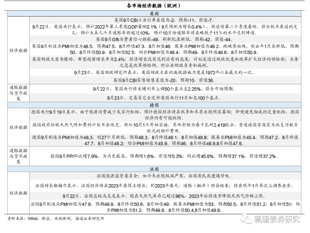 美联储下调经济增长预测。美国9月NAHB房产市场指数46,续刷2020年5月以来新低,预期47,前值49;美国8月新屋开工总数年化157.5万户,创2020年8月来新低;8月谘商会领先指标环比降0.3%,预期降0.1%,前值由降0.4%修正至降0.5%;美国9月S&P Global制造业PMI初值为51.8,高于预期和前值;服务业PMI初值为49.2,预期45;综合PMI初值为49.3,预期46.1。美联储预计,2022年GDP增长0.2%(6月的预估为增长1.7%),2023年增长1.2%(6月的预估为增长1.7%),2024年增长1.7%(6月的预估为增长1.9%);2025为增长1.8%,长期增长预估中值为1.8%(6月的预估为增长1.8%)。美联储75bp加息落地,鲍威尔讲话延续抗通胀表态。美联储连续第三次升息75基点;美联储的预测中值显示2023年利率将为4.6%,2024年为3.9%,2025年为2.9%。9月21日,美联储主席鲍威尔表示,考虑到高通胀,应需要将联邦基金利率降至限制性水平,并在一段时间内保持该水平;9月22日,美国财长耶伦表示,已经看到了供应限制有所缓解的证据,相信通货膨胀一定会在明年下降;但也许2023年无法达到2%的通胀目标,美国仍然容易受到俄乌冲突带来的供应冲击;截至9月24日,据CME“美联储观察”:市场预期11月联邦基金利率升至3.5%~3.75%的概率为27.10%,升至3.75%~4%的概率为72.90%;全年加息至少17次(加息至4.25%~4.5%)的概率为74.3%,加息至少18次(加息至4.5%~4.75%)的概率为3.70%(假设每次加息25BP)。美国。主权债:美债下跌。22/9/16-22/9/23,2Y美债利率上行35bp至4.2%,10Y美债利率上行24bp至3.69%;10Y-2Y美债利差倒挂幅度由9月16日的40bp走阔至51bp。信用债:高收益债指数下跌。欧洲。主权债:法国、英国、德国债市下跌,长短端利率均上行。信用债:投资级债券指数、高收益债指数均下跌。亚洲。主权债:中国、日本债市分化,短端利率上行,长端利率下行;韩国、新加坡债市下跌,长短端利率均上行。信用债:中债信用债总指数上涨,日本公司债指数、新兴国家(除日本)非投资级指数均下跌。新兴市场。主权债:俄罗斯、印度、印尼债市下跌,长短端利率均上行;巴西债市上涨,长短端利率均下行;墨西哥短端利率上行;巴基斯坦长端利率上行;南非、土耳其债市分化,短端利率下行,长端利率上行。信用债:投资级非主权债指数、高收益债指数均下跌。中资美元债:投资级收益率平均上行,投机级价格平均下跌。投资级中资美元债收益率平均上行28.1BP,投机级中资美元债价格平均下跌0.73%。--------------------