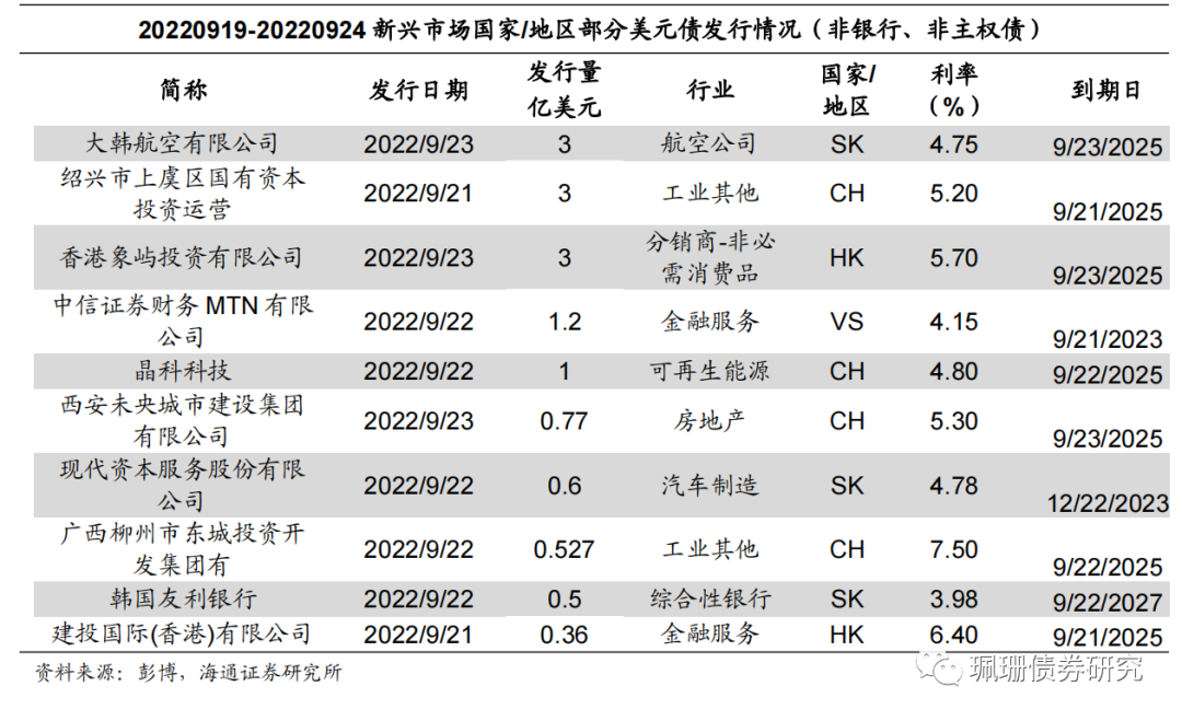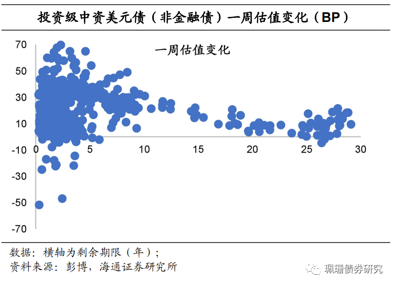 上周投资级中资美元债收益率平均大幅上行。根据我们的样本库,9月23日投资级中资美元债(非金融债)收益率与9月16日相比平均上行28.1BP。具体来看,3年期及以下债券收益率平均上行25.65BP,3-5年期债券收益率平均上行32.20BP,7年期及以上期限的债券收益率平均上行18.90BP。