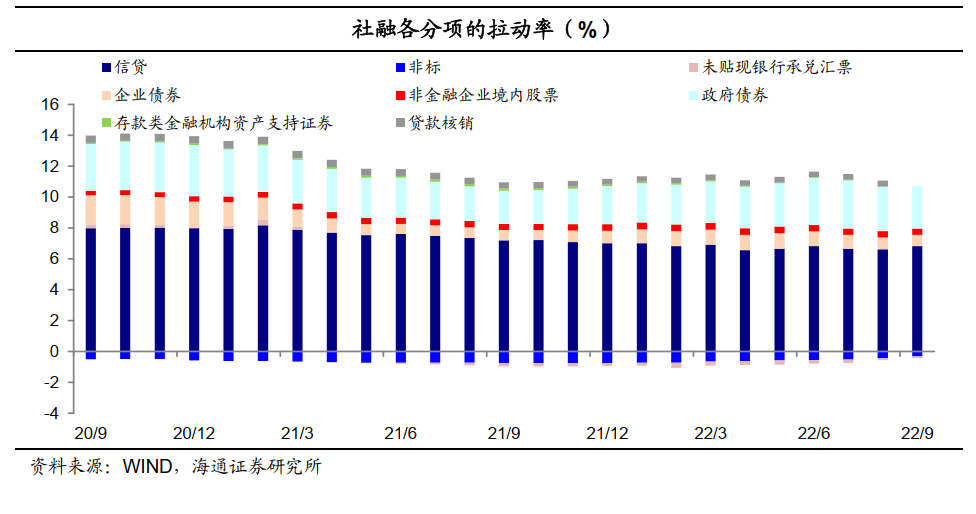 从分项同比增速来看,扣除政府债后的社融存量同比增速为9.35%,环比回升了0.29个百分点;其中政府债和企业债是社融的主要拖累项;社融口径信贷存量增速转为回升,同比增速提升0.3个百分点至11.1%、为今年7月以来新高。![]()