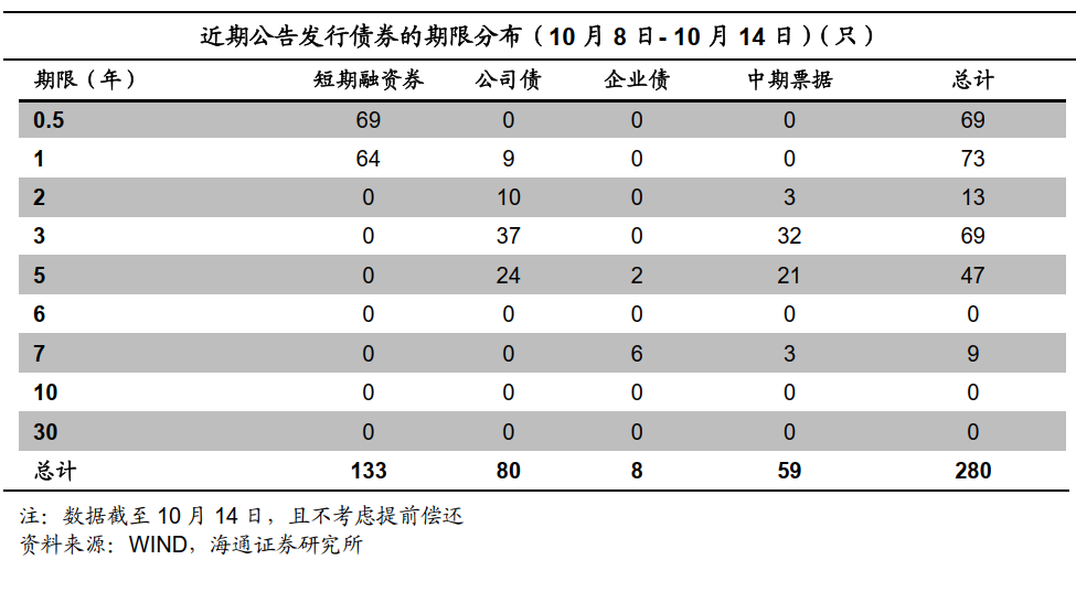 信用债期限利差走扩。具体来看,截至10月14日,5年期和3年期的AAA中票期限利差为33BP,较前一交易周末上行1BP;5年期和3年期的AA中票期限利差为69BP,较前一交易周末上行1BP;5年期和1年期AAA中票的期限利差为86BP,较前一交易周末上行3BP。