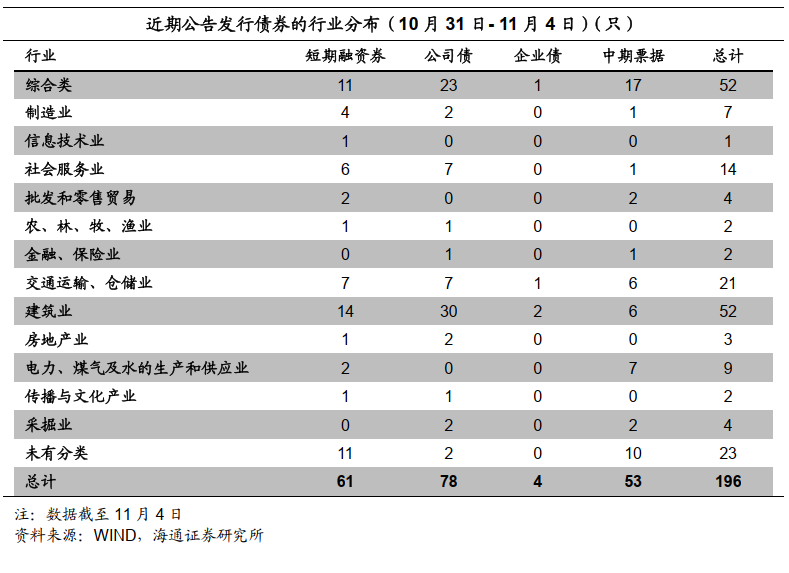 地产行业信用利差走扩。具体来看,截至11月4日,AAA级房地产行业信用利差88BP,较前一交易周末上行8BP。AA级房地产行业信用利差94BP,较前一交易周末上行1BP。地产行业超额利差走扩。具体来看,截至11月4日,AAA级地产行业超额信用利差为174BP,较前一交易周末上行121BP。AA级地产行业超额信用利差为77BP,较前一交易周末上行48BP。高等级债中,钢铁和房地产是利差最高的两个行业。AAA级钢铁行业中票平均利差为115BP,房地产行业中票平均利差为88BP,其次是综合类行业利差为65BP。公用事业是平均利差最低的行业,目前为24BP。中等级债券中,化工行业利差最高,其次为建筑装饰、综合,其中AA+等级化工行业利差为195BP,建筑装饰行业利差则是落在181BP,而AA+等级综合类行业利差则是落在179BP。最后,建筑材料和机械设备行业利差水平相对最低,均为47BP。2.1 净供给减少