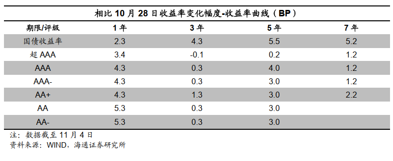 信用债等级利差分化。具体来看,截至11月4日,1年期短期品种AA级与AAA级中票利差为23BP,较前一交易周末上行1BP,3年期AA级与AAA级中票利差为37BP,与前一交易周末持平;5年期AA级与AAA级中票利差为65BP,较前一交易周末下行1BP。信用债期限利差走扩或持平。具体来看,截至11月4日,5年期和3年期的AAA中票期限利差为38BP,较前一交易周末上行4BP;5年期和3年期的AA中票期限利差为67BP,较前一交易周末上行3BP;5年期和1年期AAA中票的期限利差为79BP,与前一交易周末持平。![]()