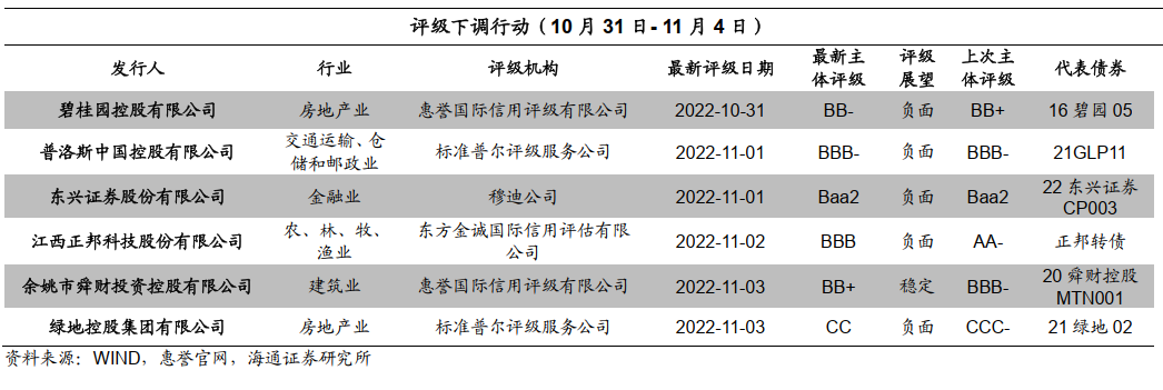 本周评级下调的发行人有6家,为余姚市舜财投资控股有限公司,绿地控股集团有限公司,江西正邦科技股份有限公司,普洛斯中国控股有限公司,东兴证券股份有限公司,碧桂园控股有限公司。