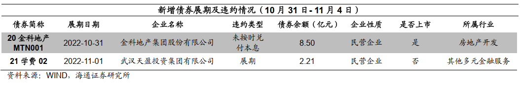 本周新增展期及违约债券2只,分别为20金科地产MTN001,21学费02。