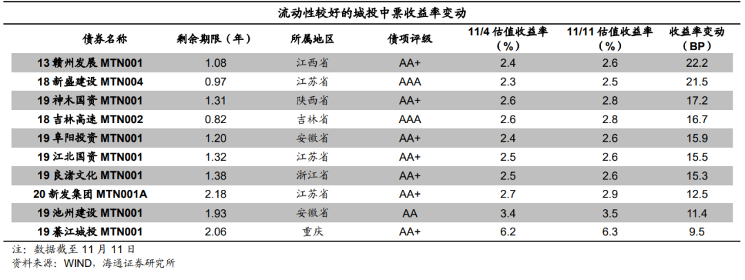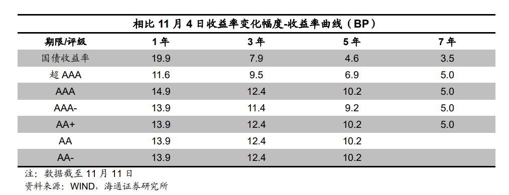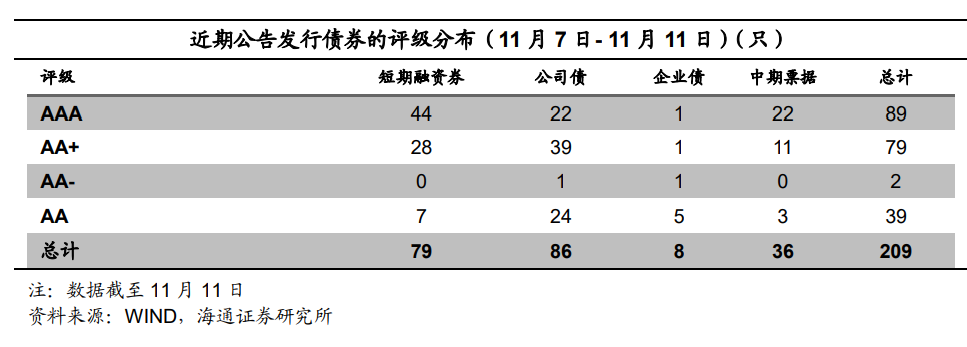 本周债市信用利差走扩或持平。具体来看,截至11月11日,3年期AAA等级中票信用利差为22BP,与前一交易周末持平,5年期AAA等级中票信用利差为37BP,较前一交易周末上行2BP;3年期AA+等级中票信用利差为44BP,与前一交易周末持平,5年期AA+等级中票信用利差为60BP,较前一交易周末上行2BP;3年期AA等级中票信用利差为59BP,与前一交易周末持平,5年期AA等级中票信用利差为103BP,较前一交易周末上行2BP。