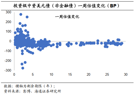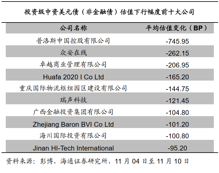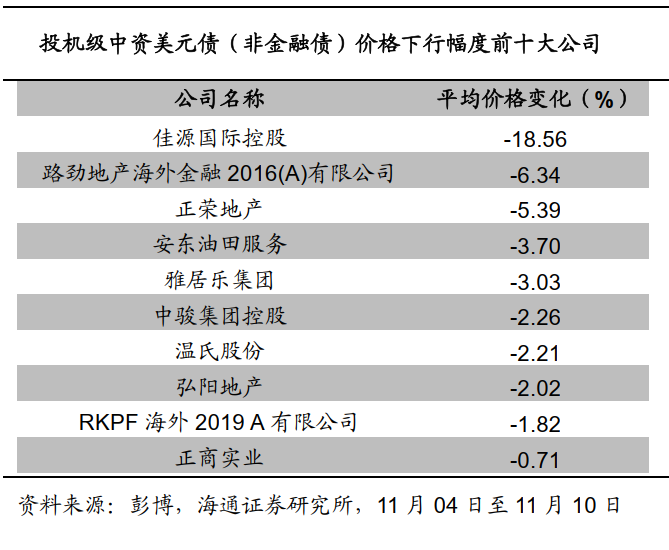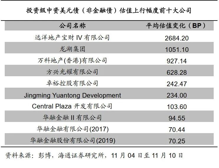上周投资级中资美元债收益率平均下行。根据我们的样本库,11月10日投资级中资美元债(非金融债)收益率与11月04日相比平均下行18.2BP。具体来看,3年期及以下债券收益率平均下行12.8BP,3-5年期债券收益率平均下行32.6BP,7年期及以上期限的债券收益率平均下行28BP。![]()