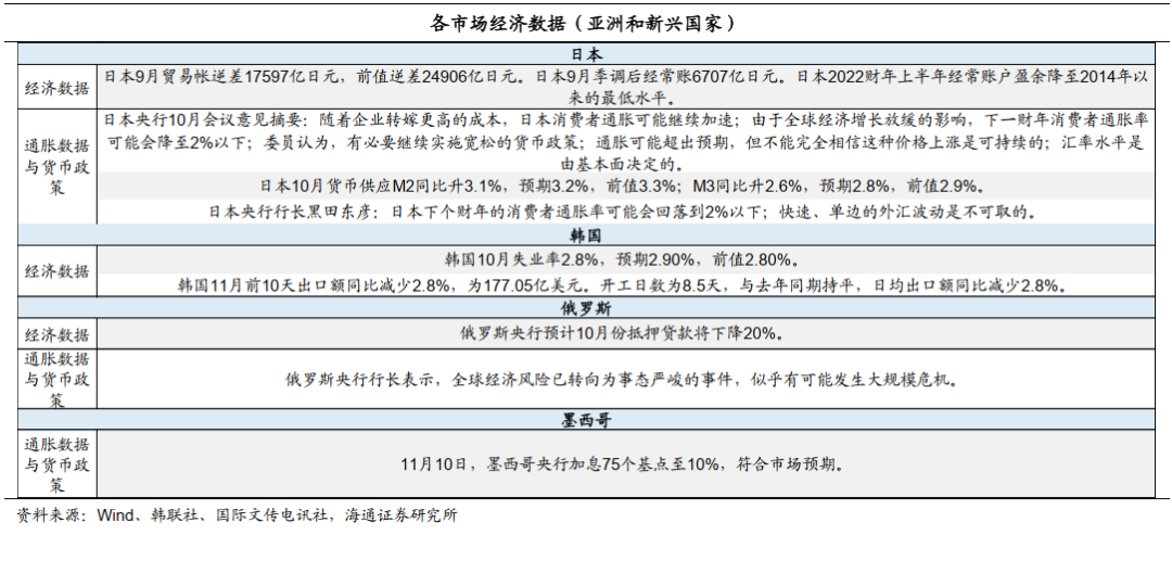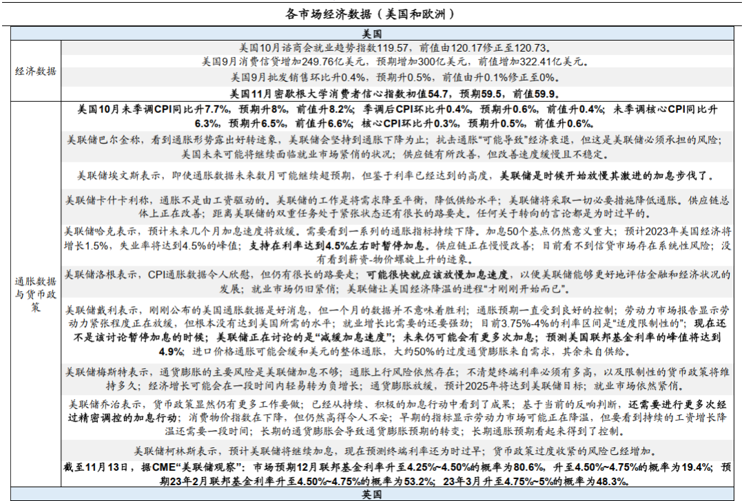 美国密歇根大学消费者信心指数低于前值和预期。美国9月消费信贷增加249.76亿美元,低于前值和预期;美国9月批发销售环比升0.4%,预期升0.5%,前值由升0.1%修正至0%;美国11月密歇根大学消费者信心指数初值54.7,预期59.5,前值59.9。美国通胀低于预期,美联储官员表态放缓加息节奏。美国10月未季调CPI同比升7.7%,预期升8%,前值升8.2%;季调后CPI环比升0.4%,预期升0.6%,前值升0.4%;美联储埃文斯表示,即使通胀数据未来数月可能继续超预期,但鉴于利率已经达到的高度,美联储是时候开始放慢其激进的加息步伐了;美联储哈克表示,预计未来几个月加息速度将放缓,支持在利率达到4.5%左右时暂停加息;美联储戴利表示,未来仍可能会有更多次加息,预测美国联邦基金利率的峰值将达到4.9%;截至11月13日,据CME“美联储观察”:市场预期12月联邦基金利率升至4.25%~4.50%的概率为80.6%,升至4.50%~4.75%的概率为19.4%;预期23年2月联邦基金利率升至4.50%~4.75%的概率为53.2%;23年3月升至4.75%~5%的概率为48.3%。美国。主权债:美债上涨。22/11/03-22/11/10,2Y美债利率下行37bp至4.34%,10Y美债利率下行32bp至3.82%;10Y-2Y美债利差倒挂幅度由11月03日的57bp收窄至52bp。信用债:高收益债指数上涨。欧洲。主权债:法国债市上涨,长短端利率均下行;英国、德国债市分化,短端利率上行,长端利率下行。信用债:投资级债券指数和高收益债指数均上涨。亚洲。主权债:中国债市下跌,长短端利率均上行;韩国债市上涨,长短端利率均下行;日本债市分化,短端利率下行,长端利率上行;新加坡债市分化,短端利率上行,长端利率下行。信用债:中债信用债总指数、日本公司债指数均下跌;新兴国家(除日本)非投资级指数上涨。新兴市场。主权债:俄罗斯、巴西债市下跌,长短端利率均上行;印度、印尼债市上涨,长短端利率均下行;墨西哥短端利率下行;巴基斯坦长端利率上行;南非债市分化,短端利率上行,长端利率下行;土耳其债市分化,短端利率下行,长端利率上行。信用债:投资级非主权债指数、高收益债指数均上涨。中资美元债:投资级收益率平均下行,投机级价格平均上涨。投资级中资美元债收益率平均下行18.2BP,投机级中资美元债价格平均上涨0.71%。--------------------