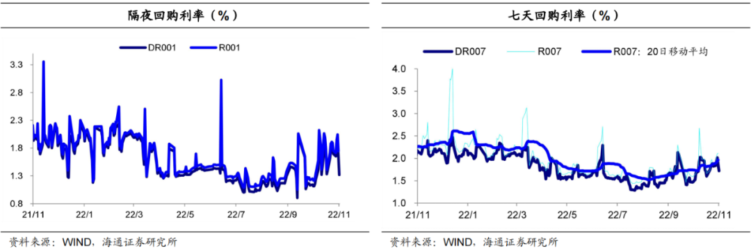隔夜资金利率先上后下,票据利率抬升。具体来说,R001均值下行6BP至1.77%,R007均值上行11BP至1.99%;DR001均值下行5BP至1.69%,DR007均值上行5BP至1.88%。3M存单发行利率持续上行、FR007-1Y互换利率先上后下;至11月18日,国股银票1M、3M、6M、1Y转贴现利率较11月11日分别+1bp、+36bp、+28bp、+15bp。