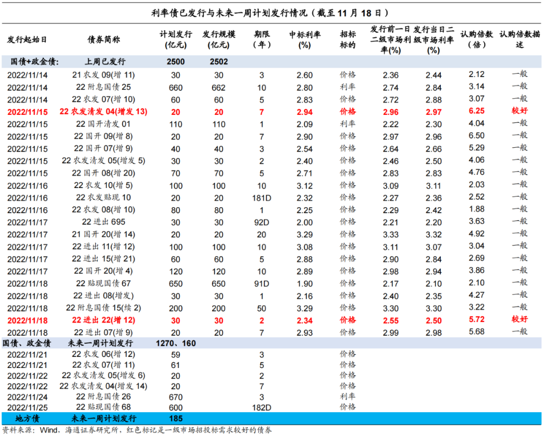 隔夜资金利率先上后下,票据利率抬升。上周央行MLF缩量续作、7D逆回购投放放量,资金面先紧后松,全周净投放资金2180亿元。R007/DR007均值+11BP/+5BP。3M存单发行利率持续上行、FR007-1Y互换利率先上后下。国股银票1M、3M、6M、1Y转贴现利率较11月11日分别+1bp、+36bp、+28bp、+15bp。净融资额减少,存单量跌价升。利率债净融资额1253亿元,环比减少358亿元。进出口行债、农发债需求分化,国债、国开债需求一般。截至11月18日,未来一周国债计划发行1270亿元,地方债185亿元,环比均下降。