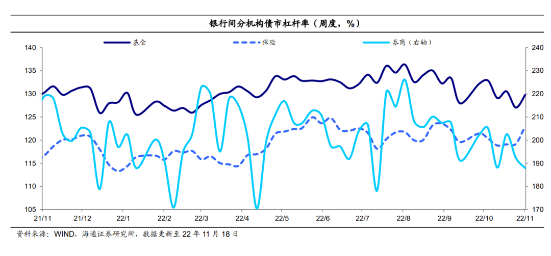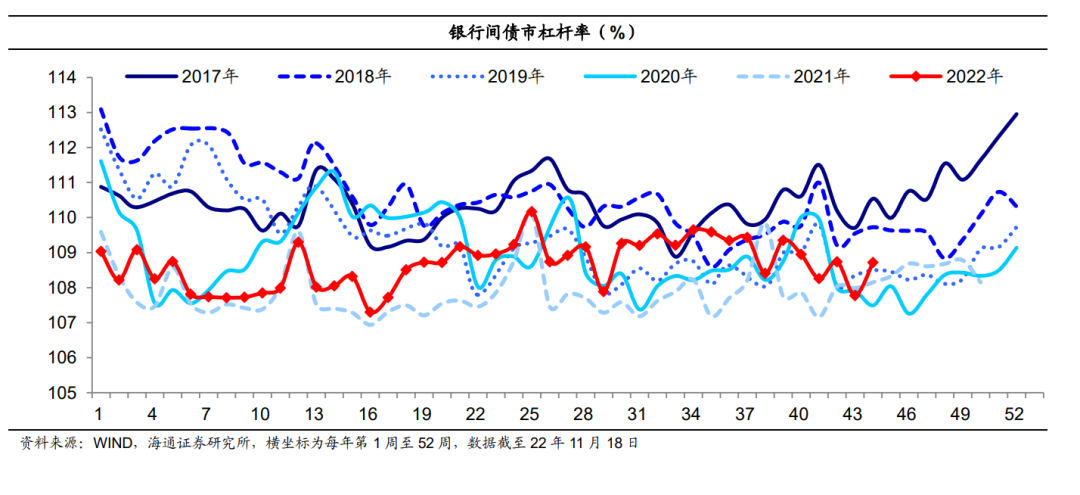 (6)银行间杠杆率转为回升。至11月18日当周银行间债市杠杆率为108.7%,环比转为上行近1个百分点、同比上行0.6个百分点。
