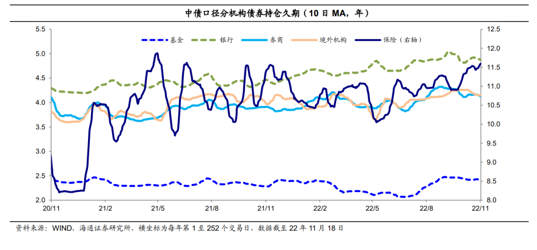 其余主要机构的债券持仓久期大多缩短(中债口径)。相较于11月11日,至11月18日仅保险债券持仓久期拉长0.05年至11.79年,其余的基金、银行、券商和境外机构的债券持仓久期分别缩短0.08年、缩短0.01年、缩短0.03年、缩短0.06年至2.36年、4.86年、4.07年、4.11年。其中境外机构的债券持仓久期仅处于近三年以来的78%分位数;保险和银行的债券持仓久期分别处于近三年以来的98%、92%分位数。