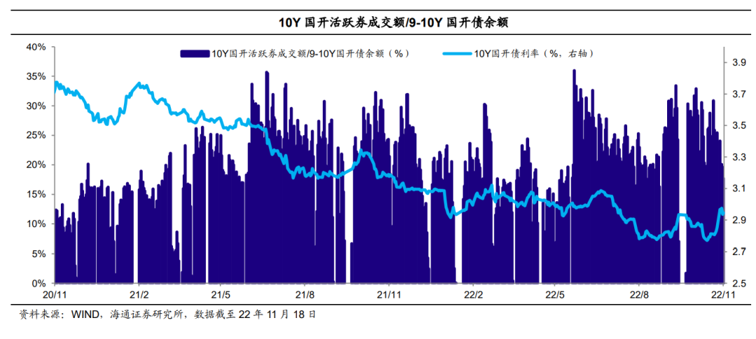(3)从10Y国开活跃券成交额/9-10Y国开债余额周均值来看,活跃券交易情绪显著降温。至11月18日10Y国开活跃券成交额/9-10Y国开债余额处于近三年以来的55%分位数,周均值环比继续大幅下降近22个百分点。![]()